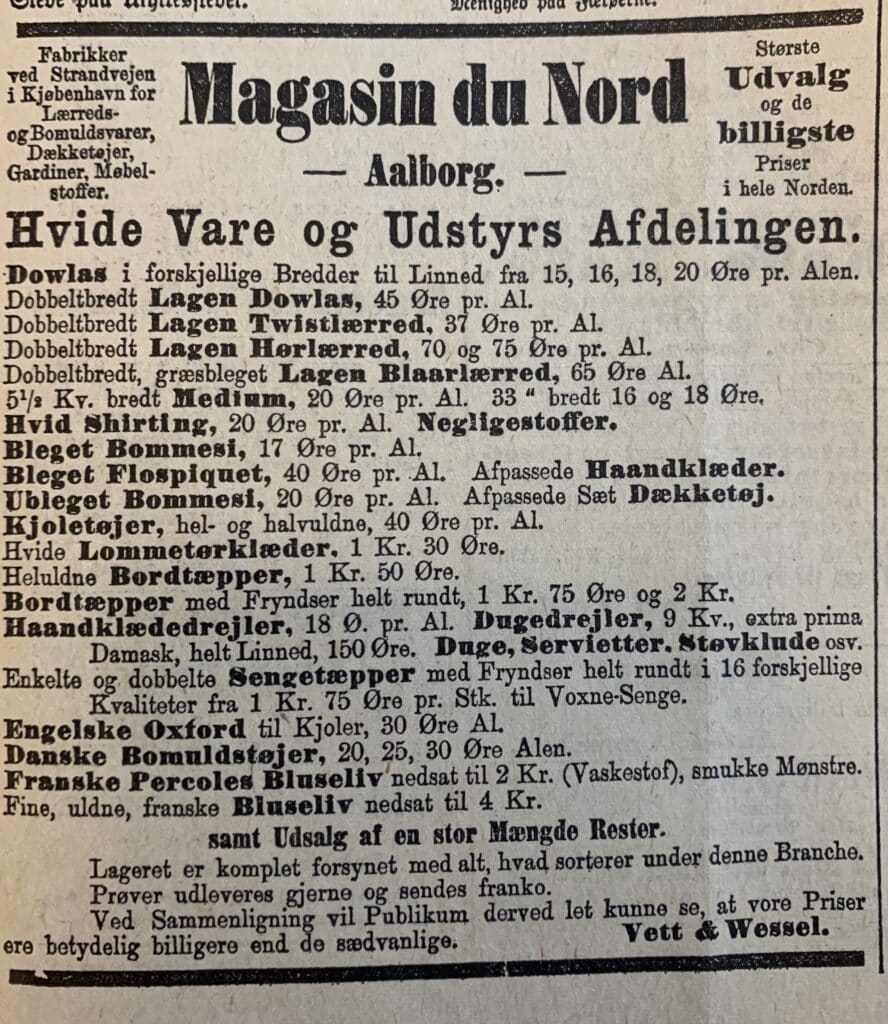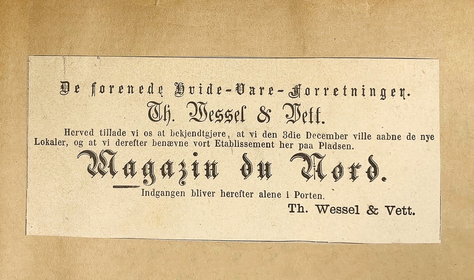 | Den første filial åbner i Aalborg. Forretningen får navnet Wessel & Co. Samme år åbnes en filial med navnet Th. Wessel & Co. på Østergade 52 i København. |
